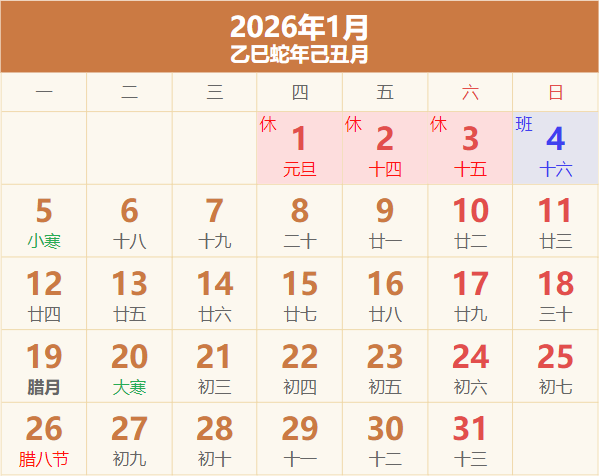 2026年元旦连续放假3天,从1月1日至3日(周四 ~ 周六)。